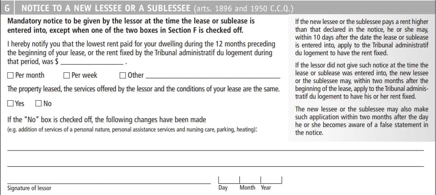 G | Notice to New Tenant or Sub-tenant | Previous rent and conditions | A legal obligation that is important to avoid future disputes. |