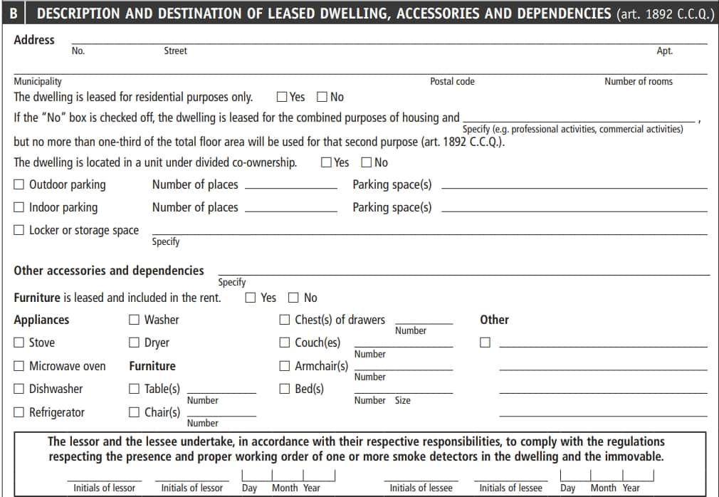 B | Identification of the Leased Dwelling | Complete address, type of dwelling, parking, storage, and other dependencies | Clearly describe what is included to avoid any ambiguity. |
