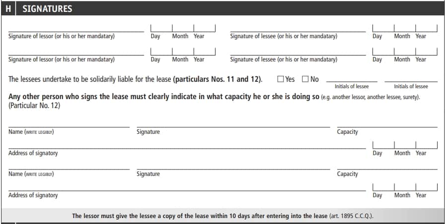 H | Signatures | Signature of the parties | Each signature is a legal commitment; be mindful of non-signing occupants. |