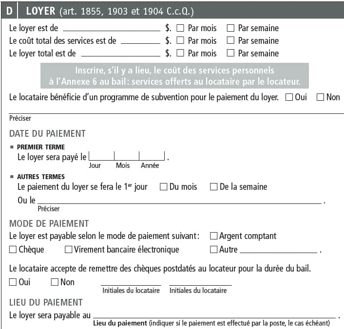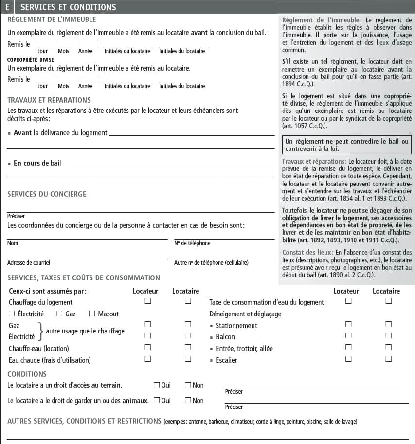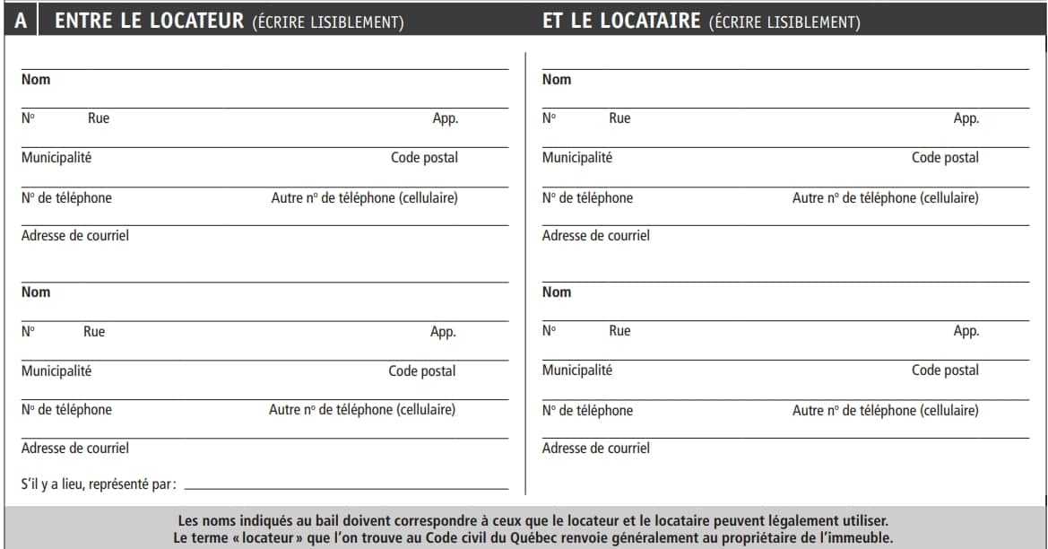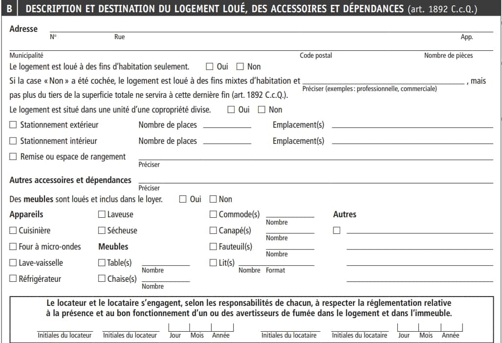 Adresse complète, logement visé, stationnement, rangement, dépendances, accessoires |