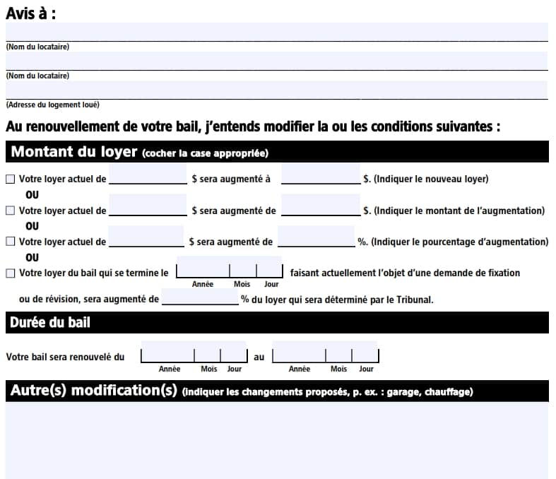 La reconduction tacite du bail n’est pas toujours dans votre intérêt. C’est pourquoi la loi vous permet d'envoyer un avis de modification pour proposer des changements. Cet avis est l'outil du propriétaire pour ajuster le loyer, mais il peut aussi servir à d'autres fins. L'avis peut inclure l'ajout d'une nouvelle annexe, la modification des conditions d'un règlement d’immeuble, l'ajout ou le retrait de services (ex. : un espace de stationnement), ou même la modification de la durée du bail.